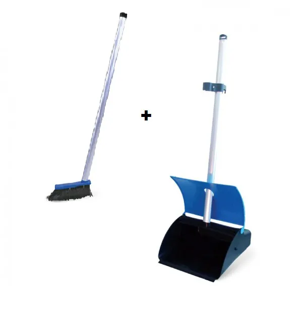 Pá coletora mini azul com cabo de alumínio e mini vassoura.